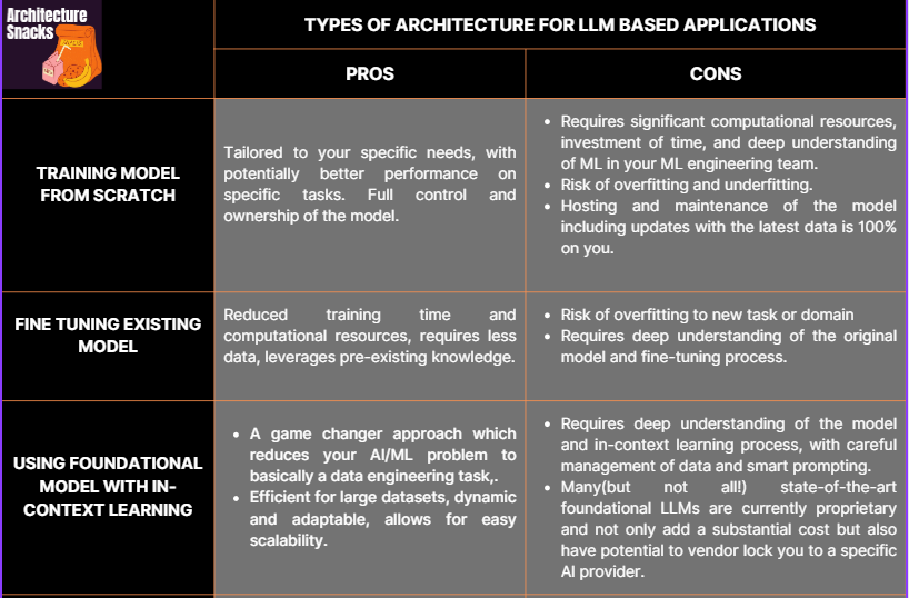 Please find below a one stop table with main points on available types of architectures for LLM-based applications.